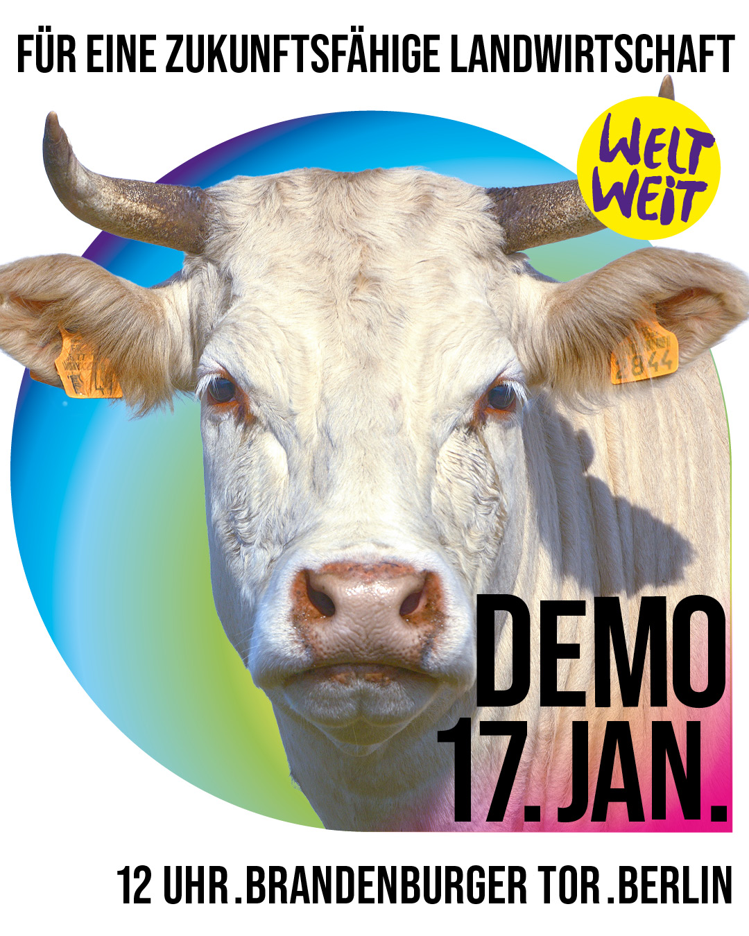 Angesichts dieser Rückschritte und Bedrohungen ruft das „Wir haben es satt!“-Bündnis am 17. Januar 2026 zur bundesweiten Demonstration für eine bäuerliche, umwelt- und tiergerechte Landwirtschaft in Berlin auf. „Haltung zeigen! Für eine zukunftsfähige Landwirtschaft weltweit“ lautet das Motto der diesjährigen Demonstration, die bereits zum 16. Mal im Berliner Regierungsviertel stattfindet.